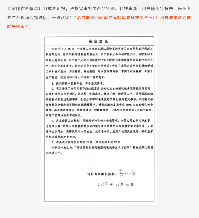 2024年1月,中國膜工業協會在浙江溫嶺主持召開了由利歐與浙江理工大學共同研發的“高性能碳化硅陶瓷膜制造成套技術與應用”科技成果鑒定會。