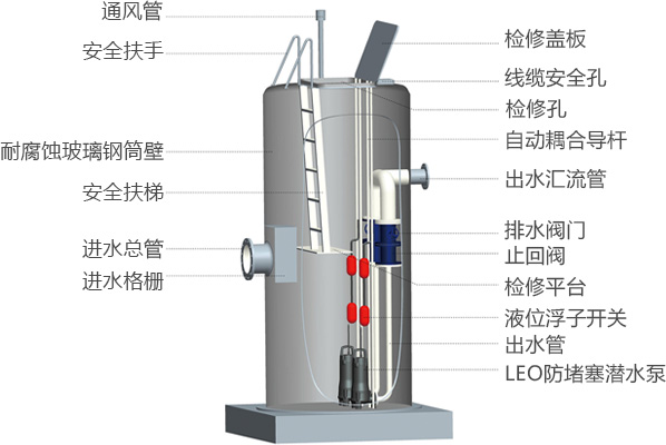 預制泵站為整體安裝;泵站內設備如泵、格柵維護時均無需進入筒體內,直接由頂部吊進吊出;在內部管道系統則在泵站內設有檢修平臺和上下爬梯。